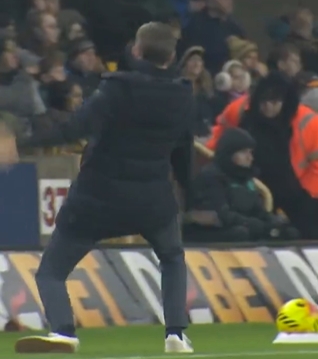 水晶宫在下半分球完胜狼队,主帅格拉斯纳在场边激情庆祝差点滑倒,随后他顺势转圈握拳鼓劲。
